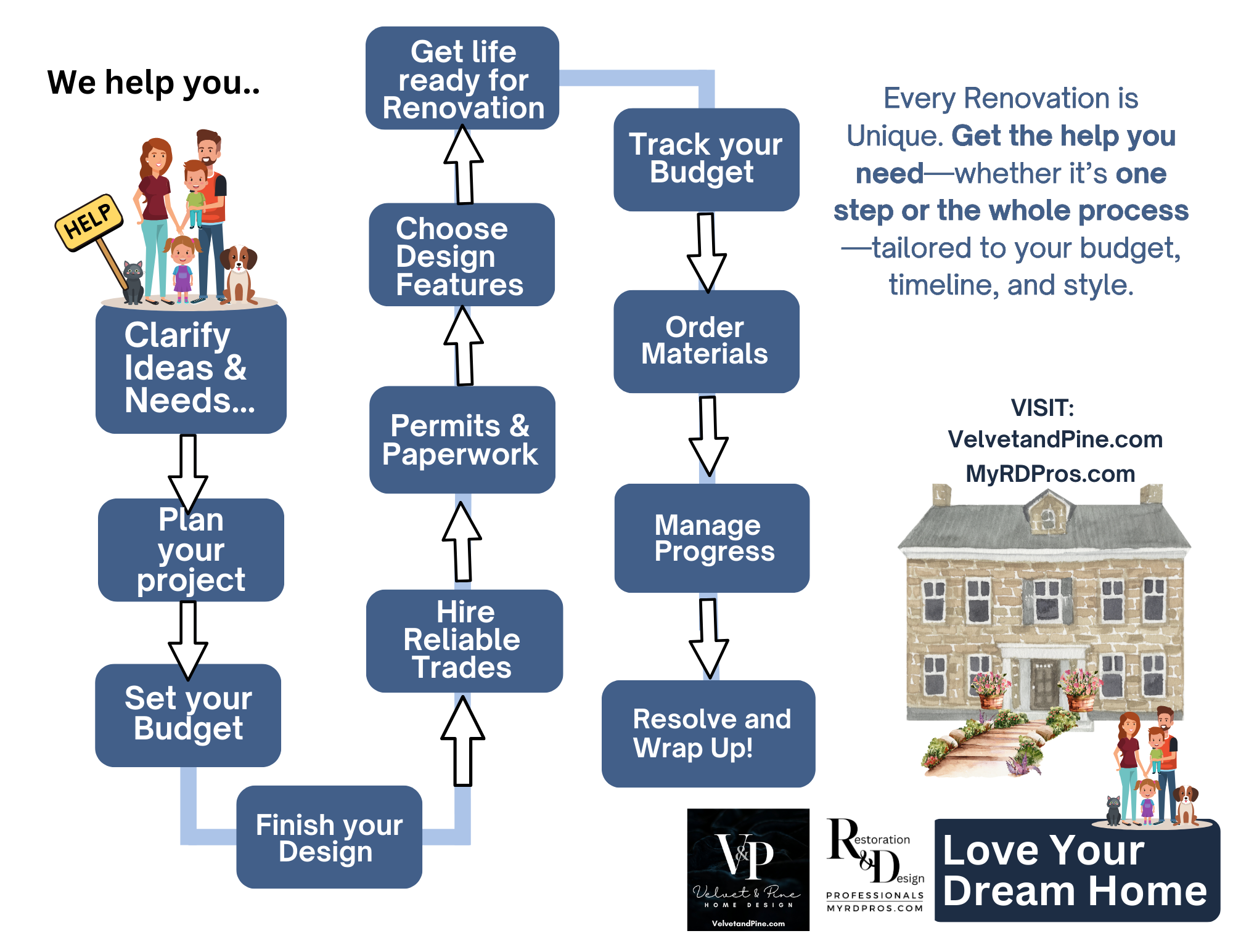 Our mission is simple: to protect your investment, save you time and money, and turn your vision into a reality. From budget planning to team coordination and problem-solving, we provide options that set you up for a successful renovation, rescue you from a renovation situation or guide you through every step of your renovation journey with clarity and confidence.
