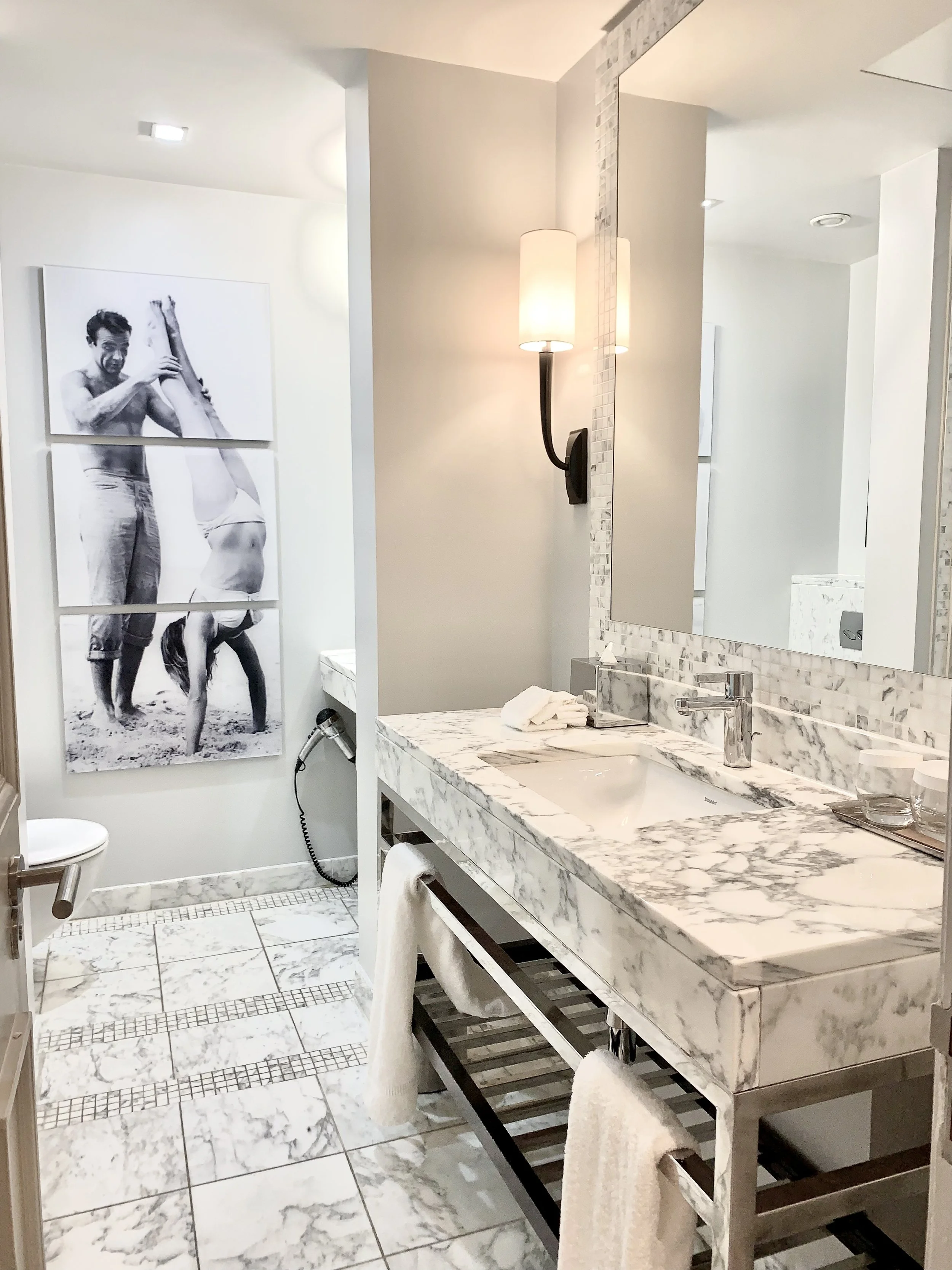 WE LOVE a clean Marble Bathroom and adding a POP of fun like this James Bond photo on the set of Dr. No.